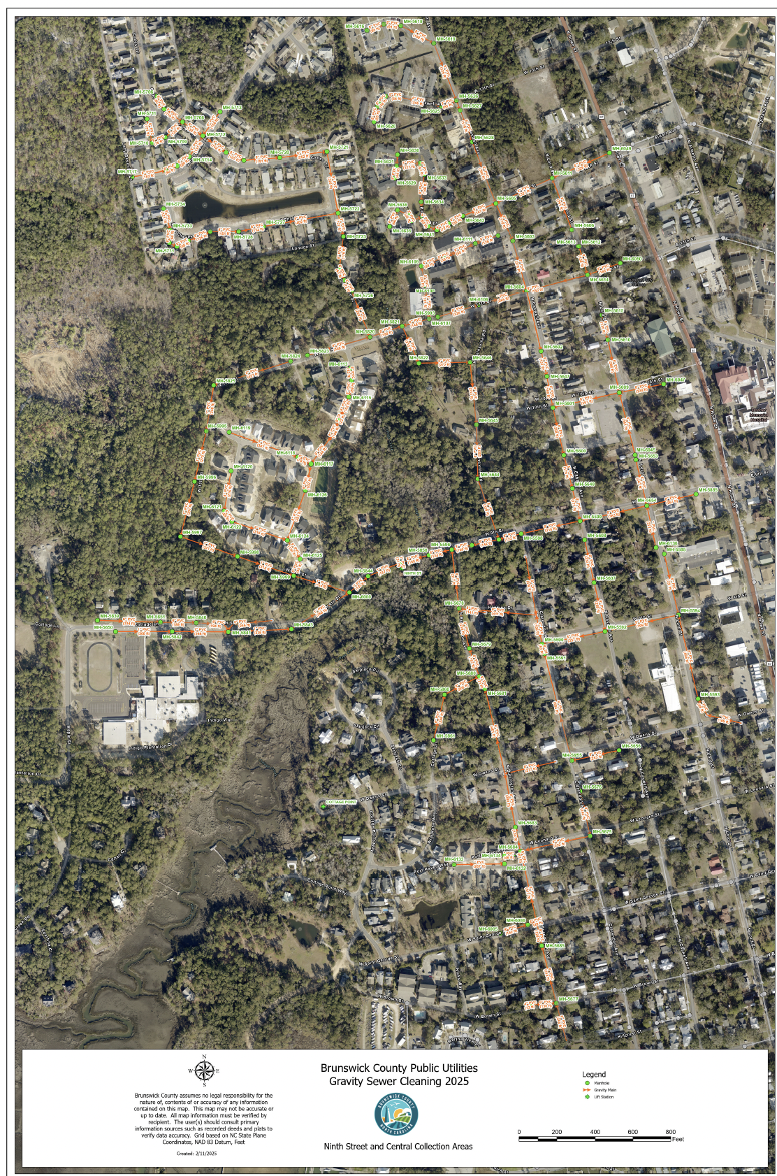 Beginning May 13, 2025, Brunswick County Public Utilities will conduct cleaning and video inspection of the gravity sewer system in the 9th Street and Central Lift Station sub-basins. This work will be performed by Sweeping Corporation, a contractor for Brunswick County Public Utilities.