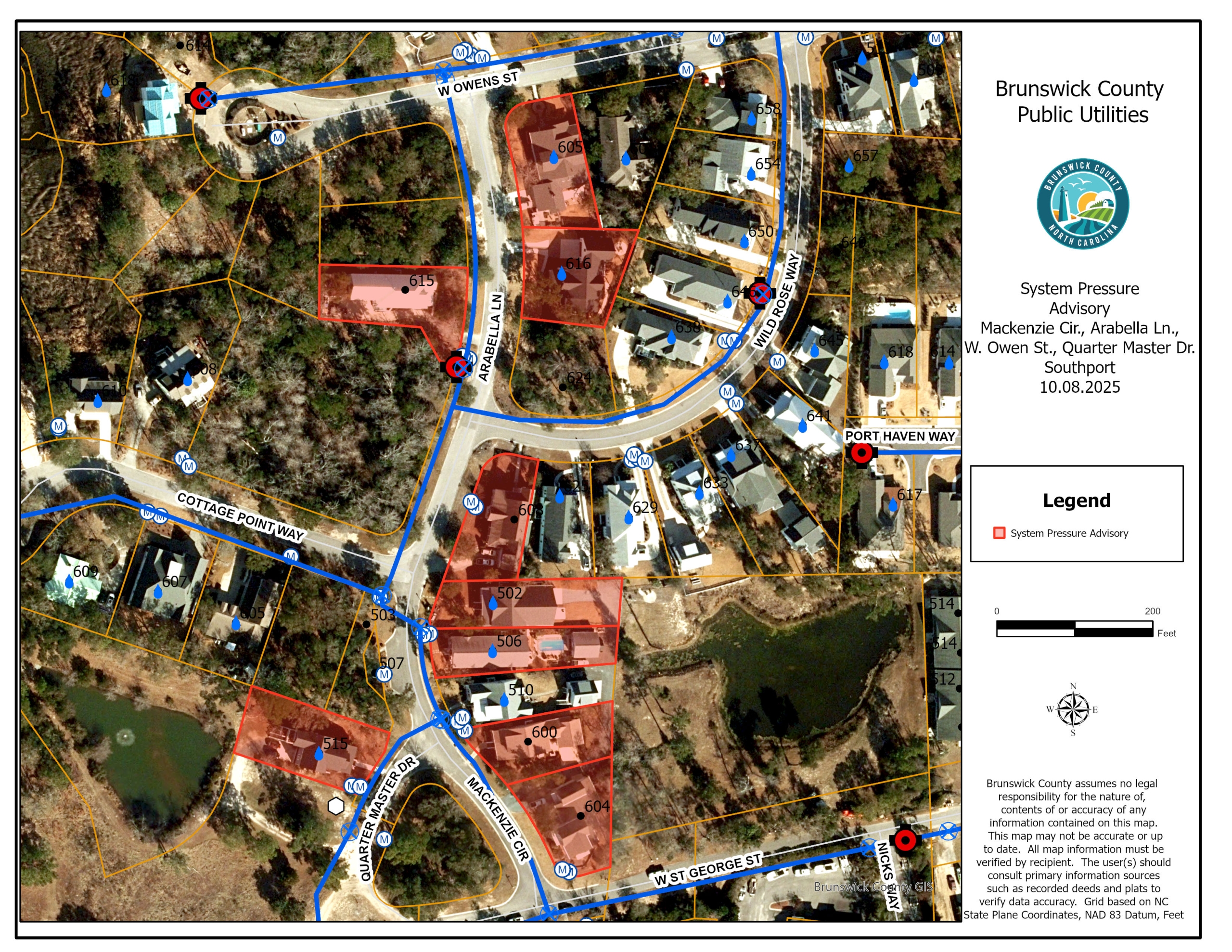 Due to water system maintenance, Brunswick County water customers in the Mackenzie Cir., Arabella Ln., W. Owen St., Quarter Master Dr. – Southport will be out of service beginning at 10:00 pm on 10.08.2025 to allow for the work to be completed. Service is expected to be restored before 6:00 am 10.09.2025. This outage affects the addresses listed below: